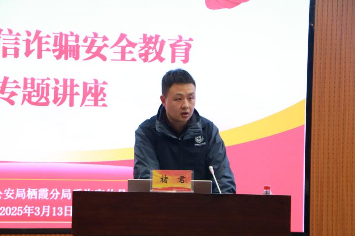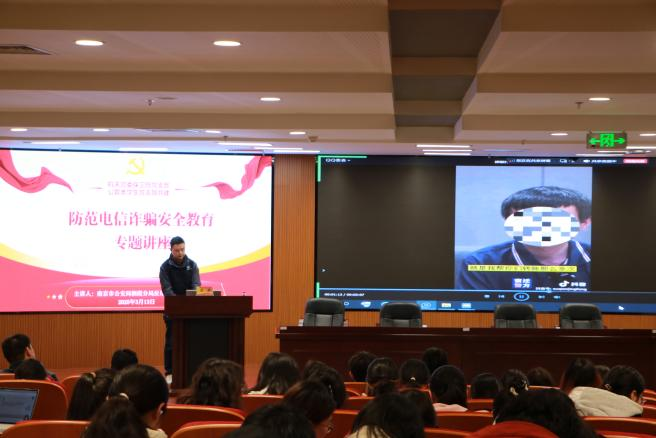 讲座伊始,南京市公安局栖霞分局反诈宣传员褚老师通过一段生动的电信诈骗宣传短片引入主题,并结合情景剧、真实案例以及多种类型的电信诈骗短视频,深入浅出地剖析了刷单诈骗、网购诈骗、演唱会门票诈骗、游戏装备交易诈骗、冒充熟人诈骗、裸聊诈骗等常见诈骗手段。他特别提醒同学们,切勿轻易点击非官方平台通过电话、短信、软件平台、论坛等发布的链接,更不要随意向他人发送验证码,以免个人信息泄露和资金损失。