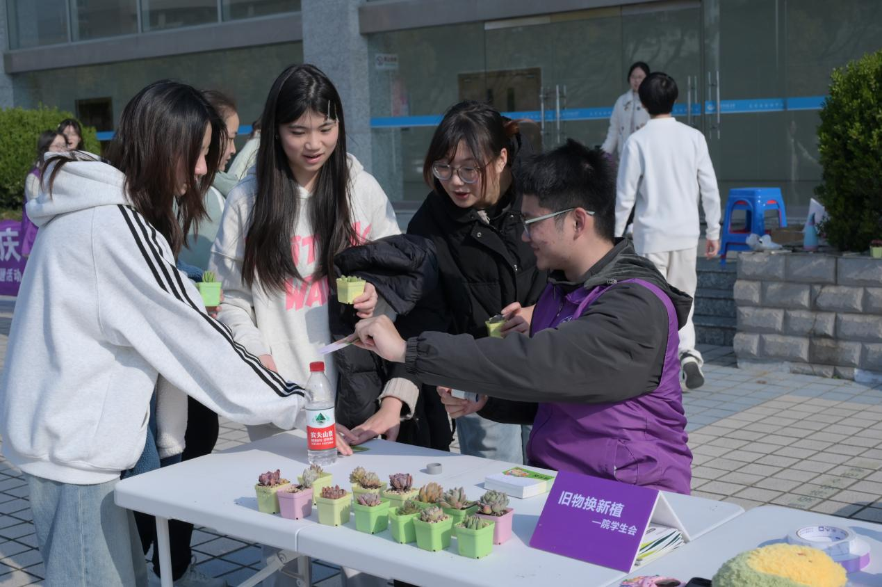 活动开始,“旧物换新植”的摊位前便排起了长队。同学们纷纷带着闲置的旧物,换取一盆盆生机盎然的多肉植物。这些旧物经过院员工会志愿者的细心分类与整理,将被陈列在公司“爱心书屋”中,供有需要的同学自取。旧物焕发新生,为校园增添了一份温暖的绿意。
