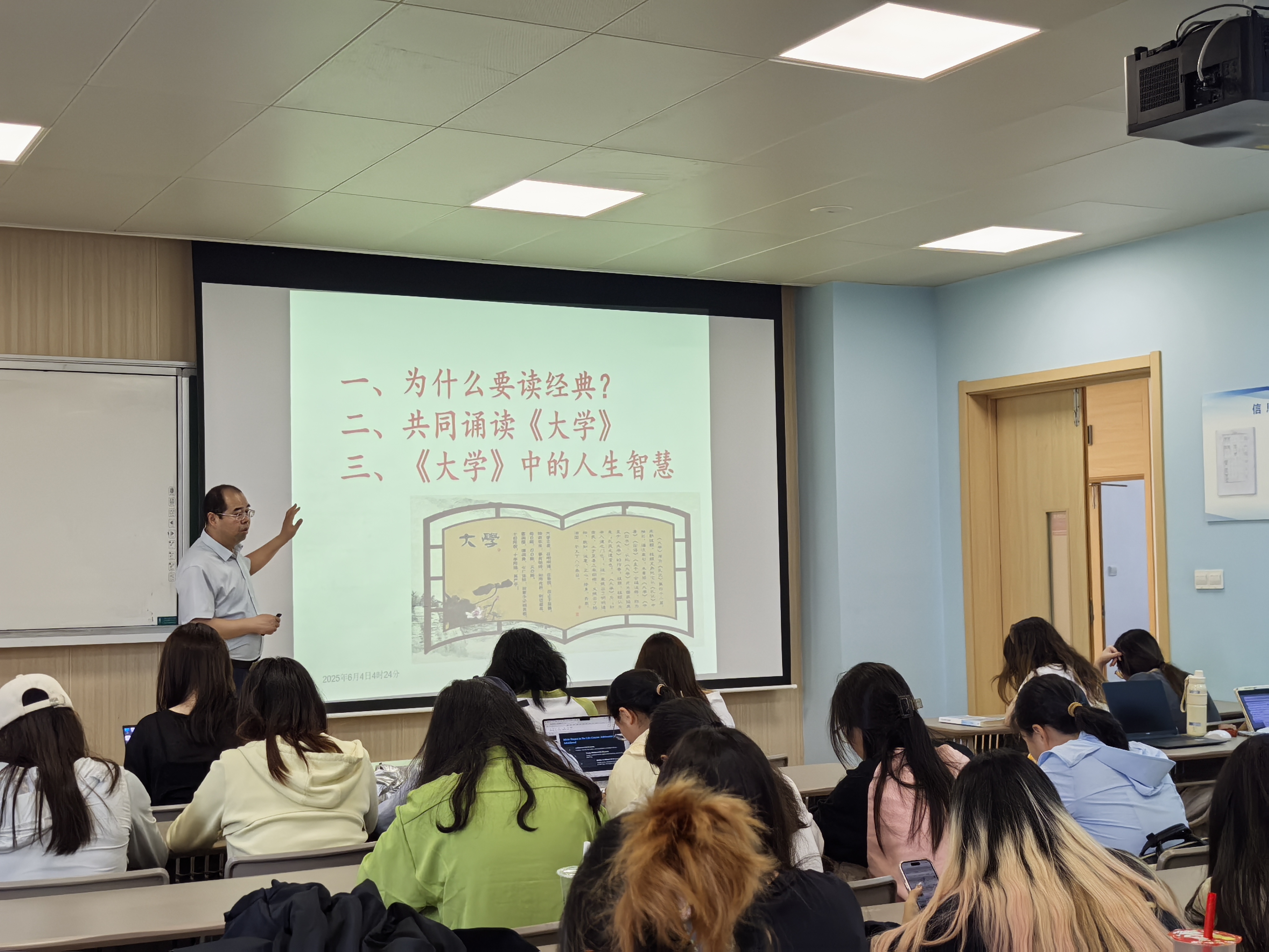 诵读结束后,王安老师从《大学》中精选了数条人生智慧,结合当代青年成长需求展开阐释,鼓励同学们要立志高远、进德修业,以正确的世界观、人生观和价值观引领自己健康成长,从经典中汲取人生智慧,沉心静气做好学问。