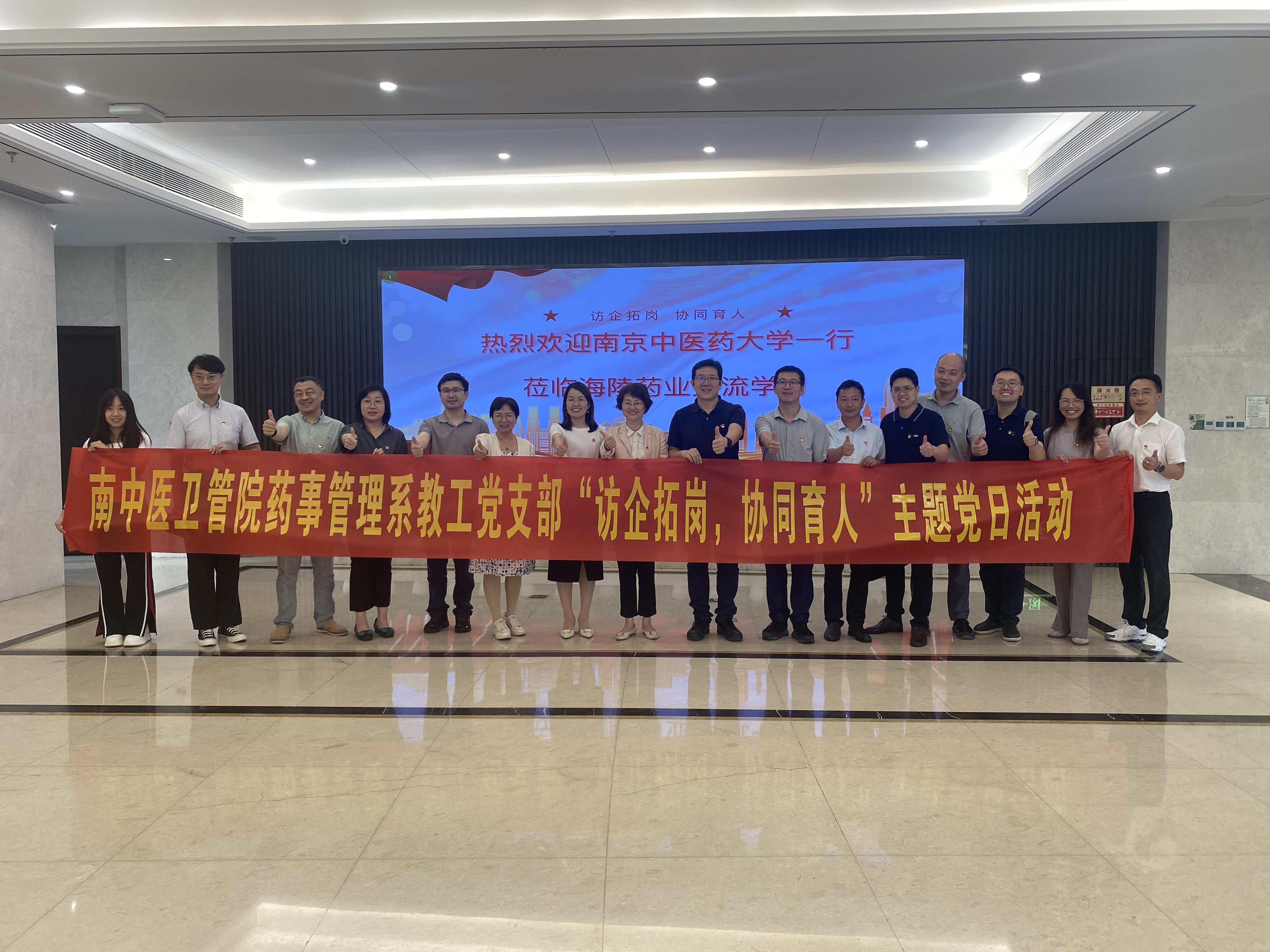 2025 年 6 月 26 日,公司药事管理系教工党支部全体党员在公司党委王红云书记带领下,前往扬子江药业集团南京海陵药业有限公司开展“访企拓岗 协同育人”党日活动,支部共建单位、校办党支部党员、校档案馆刘洪馆长协同参与此次活动。扬子江药业集团南京海陵药业有限公司党支部书记李静、副书记车越及质量部等相关部门负责人参加活动。扬子江药业集团作为我国医药行业的领军企业,在中药和化学药品研发、生产、销售等环节具有产业标志性。南京海陵药业是集团药品生产的核心板块之一,为此次活动提供了优质的实践和交流平台。