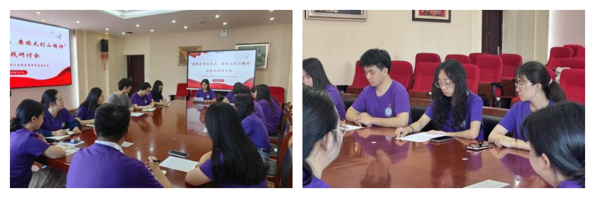 7月1日上午,为巩固实践成果,实践团在B11-414会议室召开主题研讨会。同学们结合实地见闻展开热烈讨论,在思想碰撞中深化红色认知:“个人理想只有与民族复兴同频共振,才能彰显青春的价值”、“革命薪火代代相传,青年一代须在奋斗中锤炼忠诚品格,将爱国之情转化为强国之行的实际行动”、“新时代青年必须永葆红色基因,勇担时代使命,将革命传统转化为奋进力量——以精益求精的专业本领筑牢强国根基,以真挚为民的实际行动践行初心使命,用永不褪色的奋斗激情和永不停歇的拼搏干劲,在民族复兴的伟大征程中谱写壮丽的青春之歌”。