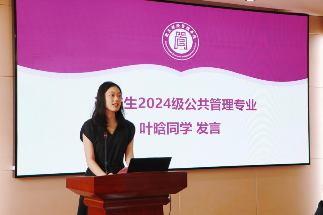 2024 级公共管理专业在校生代表叶晗同学,结合自身学习与科研经验,为新生送上实用建议。她提醒学弟学妹们要尽快适应研究生阶段的学习方式,并重点分享三点心得:一是 “身体是最珍贵的学术资本”,需保持健康作息与规律生活;二是科研探索中要 “把问题做小、逐步攻克”,避免贪多求全;三是要 “把主动请教变成日常习惯”,在与师长、同学的交流中提升自我。她希望新生能在团队合作与个人成长的双重锤炼下,找到专属的学术方向与节奏。