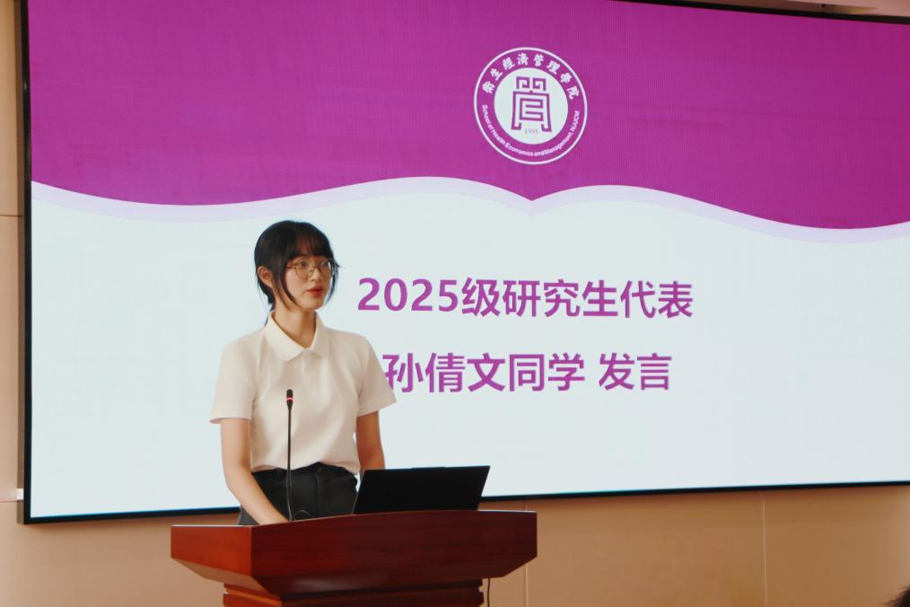 2025 级研究生代表孙倩文同学分享了自身经历与感悟。她谈及在贵州支教期间,深刻体会到基层健康服务的不易,也让她明白医药管理不仅是学术研究,更与民生福祉紧密相连。她表达了对研究生学习生活的热切憧憬,承诺将珍惜宝贵时光,勤奋钻研专业知识,努力成长为兼具理论素养与实践能力、心怀社会责任的新时代中医药管理人才。
