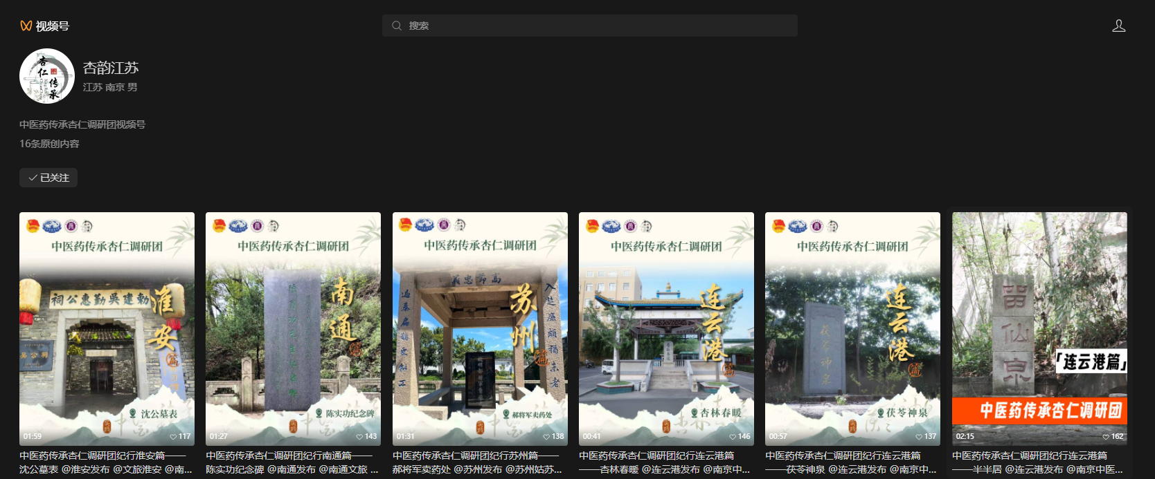 中医药传承杏仁调研团在扎实的文献调研与实地考察基础上,持续深化对江苏中医药文化遗迹保护利用的研究。目前,其调研范围已动态扩展至全省13个地级市,累计追踪评估80余处中医药重点文化遗迹的保护利用现状。2025年度,团队创新成果形式,在原有工作基础上推出视频作品,团队视频号“杏韵江苏”已发布6个作品,单个作品平均浏览量突破5000次,累计传播效果显著。